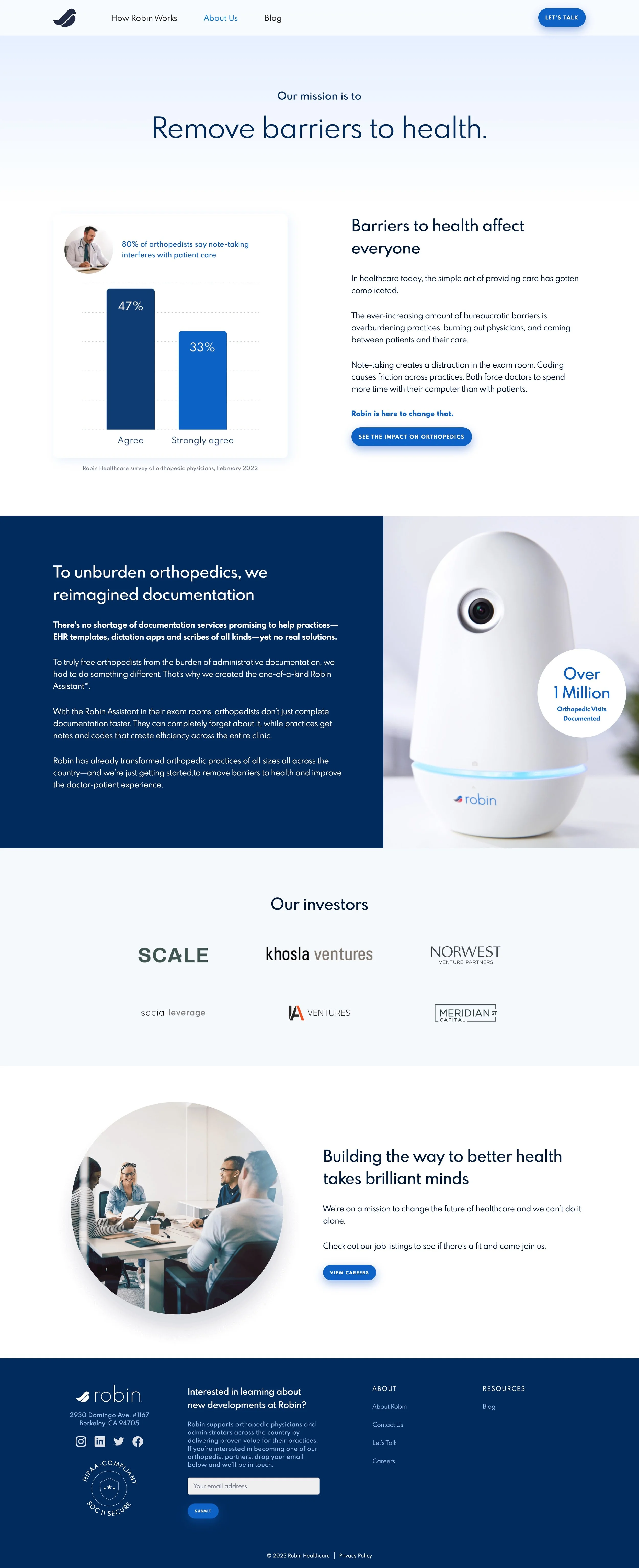 As a growing healthtech startup, Robin is always evolving. After a year of incremental updates, its website no longer spoke to Robin’s unique position in the marketplace, diverse value propositions, and primary customers in the best way possible. So, our team set out to relaunch the website to both better tell Robin’s story and boost overall engagement and conversion.